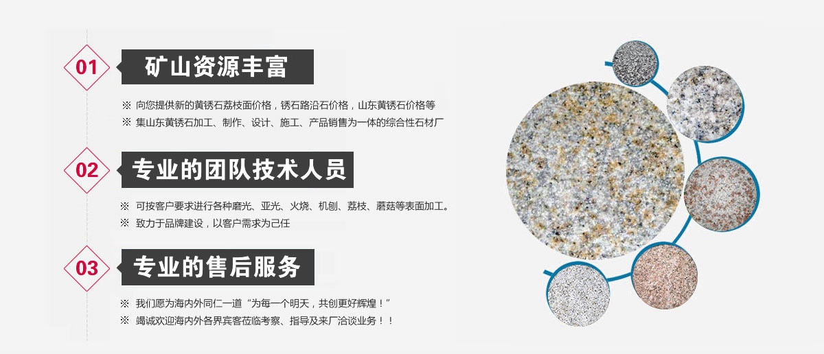 山東興銹石業(yè)有限公司常年出售黃銹石荔枝面,銹石路沿石,山東黃銹石,山東白銹石等,本石材廠(chǎng)礦山資源豐富,會(huì)滿(mǎn)足客戶(hù)的各種需求,同時(shí),山東黃銹石廠(chǎng)家直銷(xiāo)公司向您提供新的黃銹石荔枝面價(jià)格,銹石路沿石價(jià)格,山東黃銹石價(jià)格,山東白銹石價(jià)格,黃銹石價(jià)格等,本公司是一個(gè)集山東黃銹石加工、制作、設(shè)計(jì)、施工、產(chǎn)品銷(xiāo)售為一體的綜合性石材廠(chǎng)。